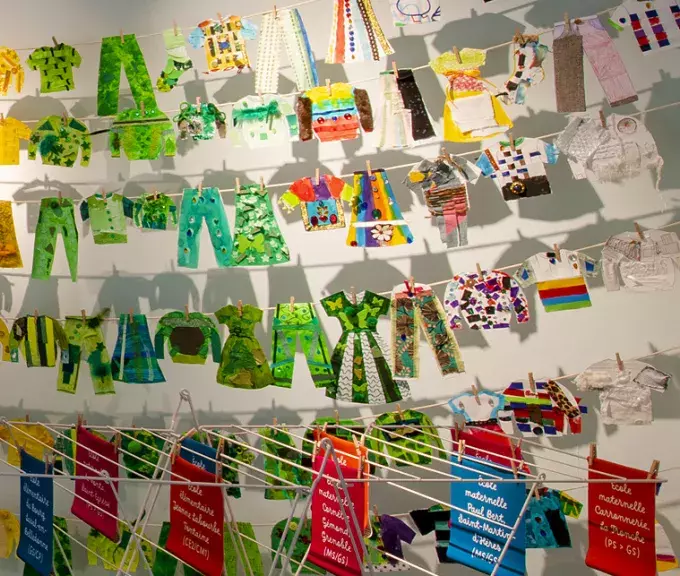 Les deux musées ont passé commande aux élèves pour créer une installation collective composée de leurs vêtements préférés. Ainsi, chaque élève a apporté la création qu’il a réalisé en classe en expliquant son choix de vêtement et de couleur.