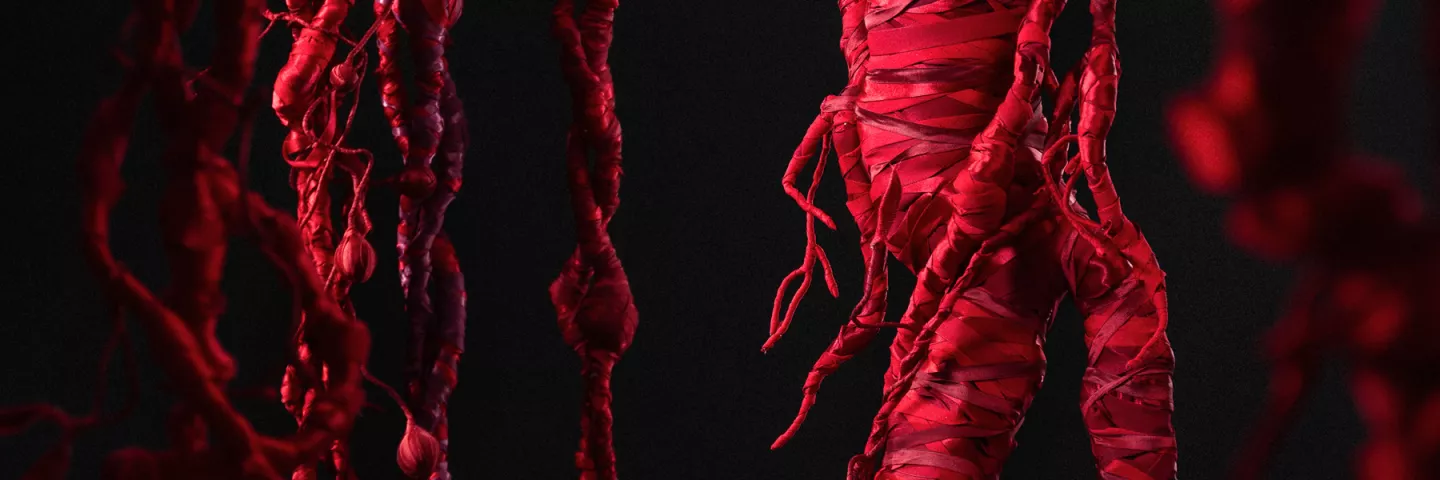 A l’aide de bretelles de soutien-gorge, l’artiste enrubanne, sculpte, donne du corps à des objets familiers souvent oubliés. Les oeuvres ainsi créées, contaminent le parcours du musée de manière douce et poétique. Cordes, chapelets, offrandes, mobilier liturgique reprennent forme et retrouvent leur place dans ce lieu atypique chargé d’histoire.